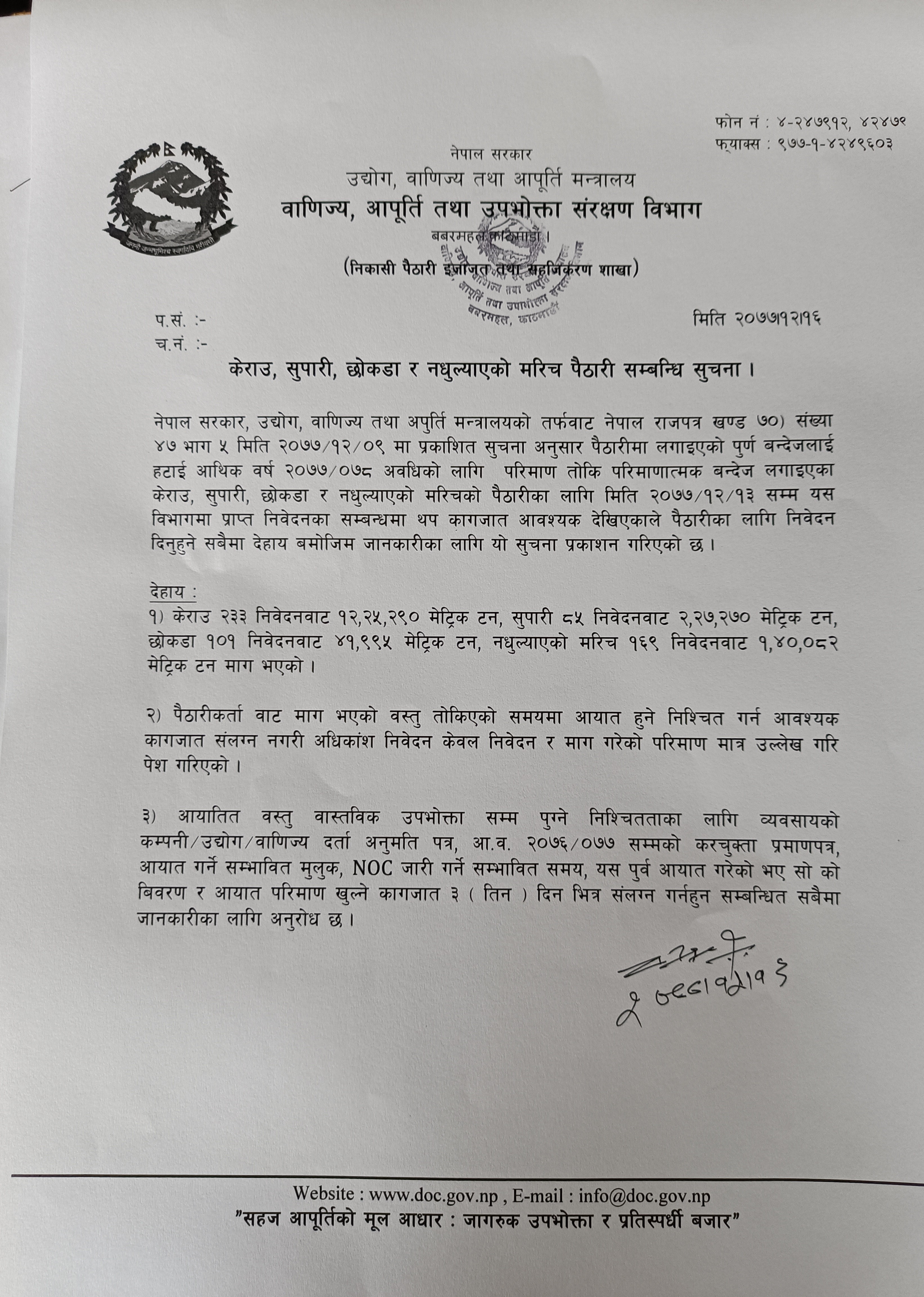 “We have not set the quotas because we have not received import requests from companies,” said Narayan Prasad Regmi, spokesman for the Ministry of Commerce. “We will determine the quota once we receive the requests to import the items.”