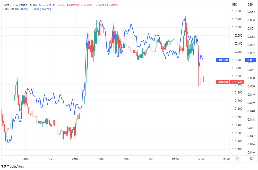 Above: The Euro/Dollar exchange rate displayed at 15-minute intervals alongside EUR/GBP.