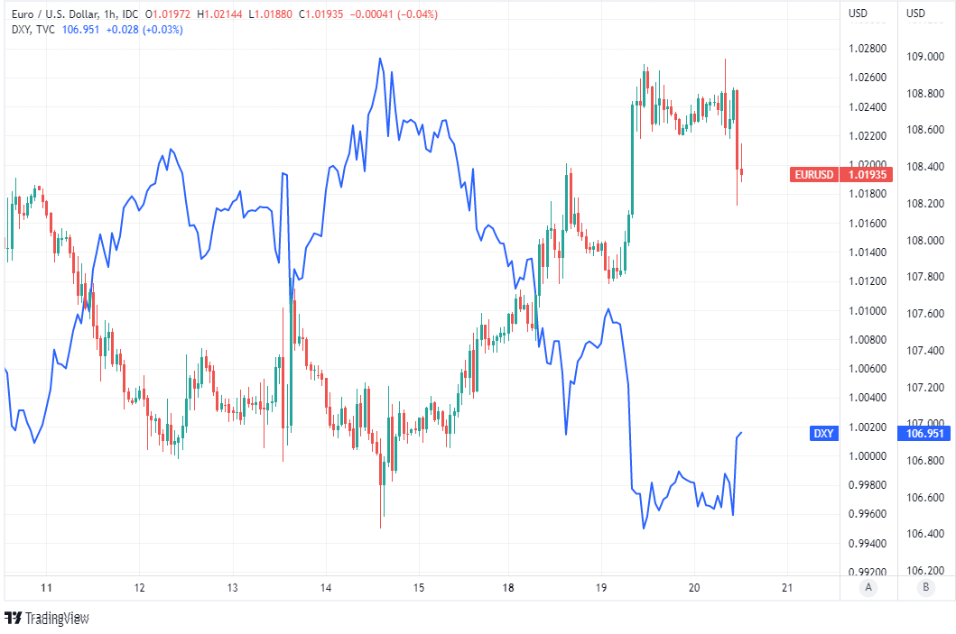 Above: The exchange rate between the euro and the dollar displayed at hourly intervals alongside the US dollar index.