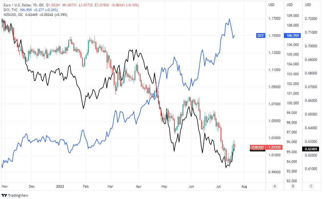 Above: Euro to dollar exchange rate shown at daily intervals alongside the US dollar index and NZD/USD.