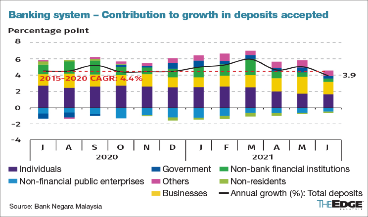 KUALA LUMPUR (September 29): Annual growth in total deposits in the Malaysian banking system slowed to 3.9% in June 2021 from 6% in March 2021, but remained supported by precautionary savings from households and businesses, said Bank Negara Malaysia (BNM).