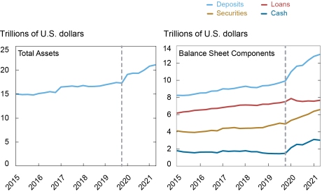 Compared to the pre-COVID level in Q4 2019, the aggregate assets of the banks in our sample increased by $ 1.8 trillion in Q1 2020 alone, and then by an additional $ 2 trillion in Q2 2021, for a total increase of over 20 percent during the COVID pandemic so far (left panel of graphic above). Most of that increase came in the form of a $ 1.7 trillion increase in securities, primarily treasury bills and agency mortgage-backed securities, and an increase of 1.5 trillion dollars. trillion dollars in cash (mostly reserves, as shown in the right panel). Combined with a smaller increase in lending of $ 180 billion (after a brief spike in Q1 2020 due to drawdowns on lines of credit), these changes have resulted in a significant increase in the share of liquid assets on banks’ balance sheets. . On the liabilities side, balance sheet expansion took place almost exclusively in the form of deposits, which increased by $ 3.1 trillion. Most of this expansion has occurred in transaction accounts, while term deposits have declined somewhat, leading to an increase in the share of funding from less stable sources.